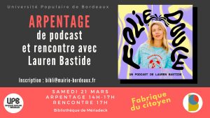 Rendez-vous le samedi 21 mars à 14h, à la bibliothèque de Mériadeck, on arpentera le podcast “Folie douce” de Lauren Bastide, dans le cadre du festival La Fabrique du citoyen : https://bibliotheque.bordeaux.fr/agenda/les-evenements/la-fabrique-du-citoyen