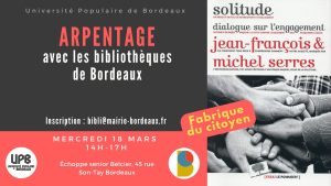 Rendez-vous le mercredi 18 mars à 14h, à l’échoppe senior de Belcier (45 rue Son-Tay), on arpentera le livre “Solitude, dialogue sur l’engagement” de Jean-François et son père Michel Serres, dans le cadre du festival La Fabrique du citoyen : https://bibliotheque.bordeaux.fr/agenda/les-evenements/la-fabrique-du-citoyen