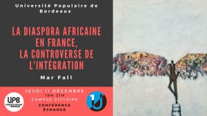 Le jeudi 11 décembre, l’UPB vous invite à écouter et échanger avec Mar Fall, sociologue de l’Université de Bordeaux, auteur de plusieurs ouvrages sur le Sénégal, sur l’immigration africaine et les Noirs de France. Il nous présentera les recherches à l’origine de son dernier livre “La diaspora africaine en France, la controverse de l’immigration”, paru à l’Atelier des Brisants.